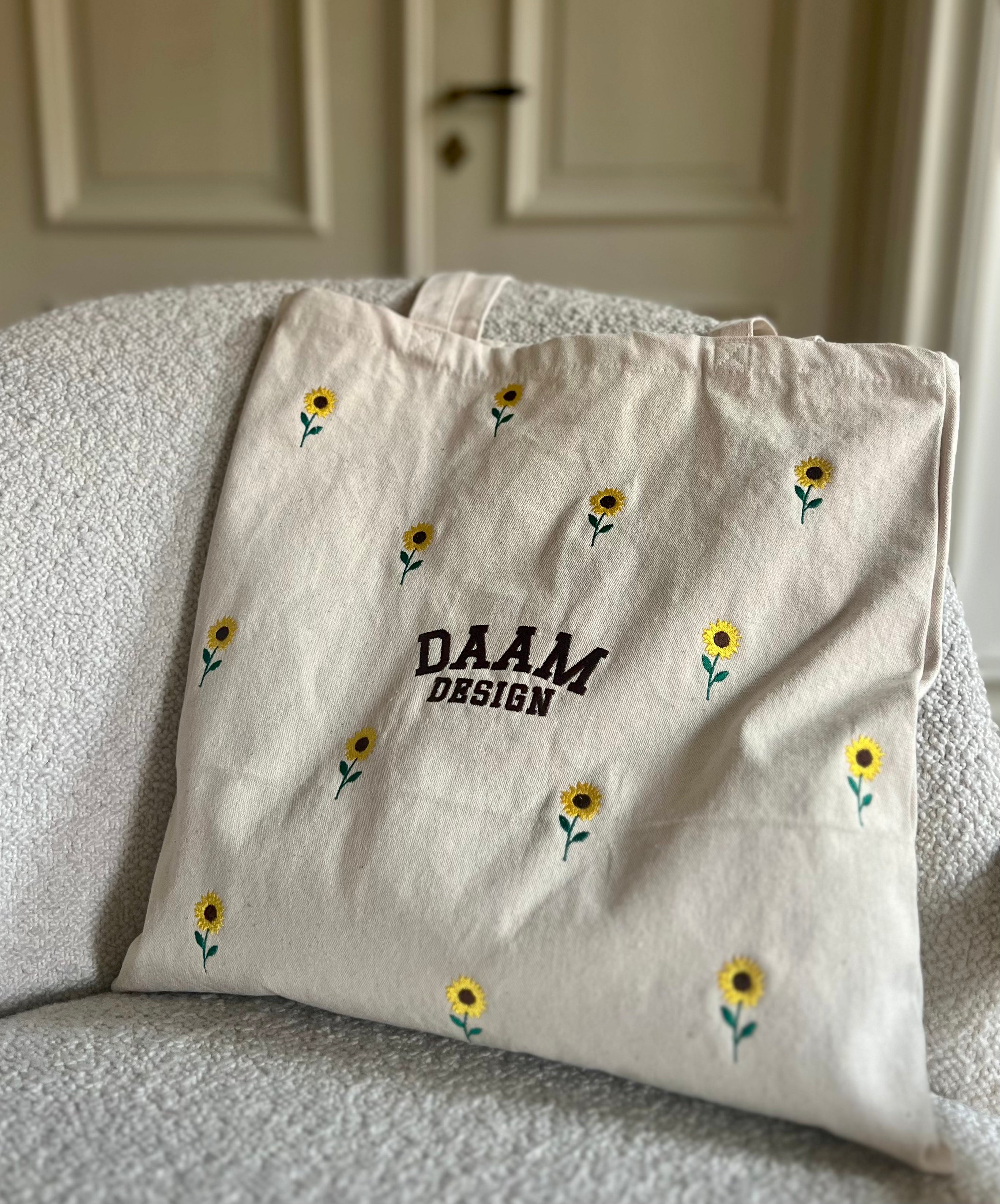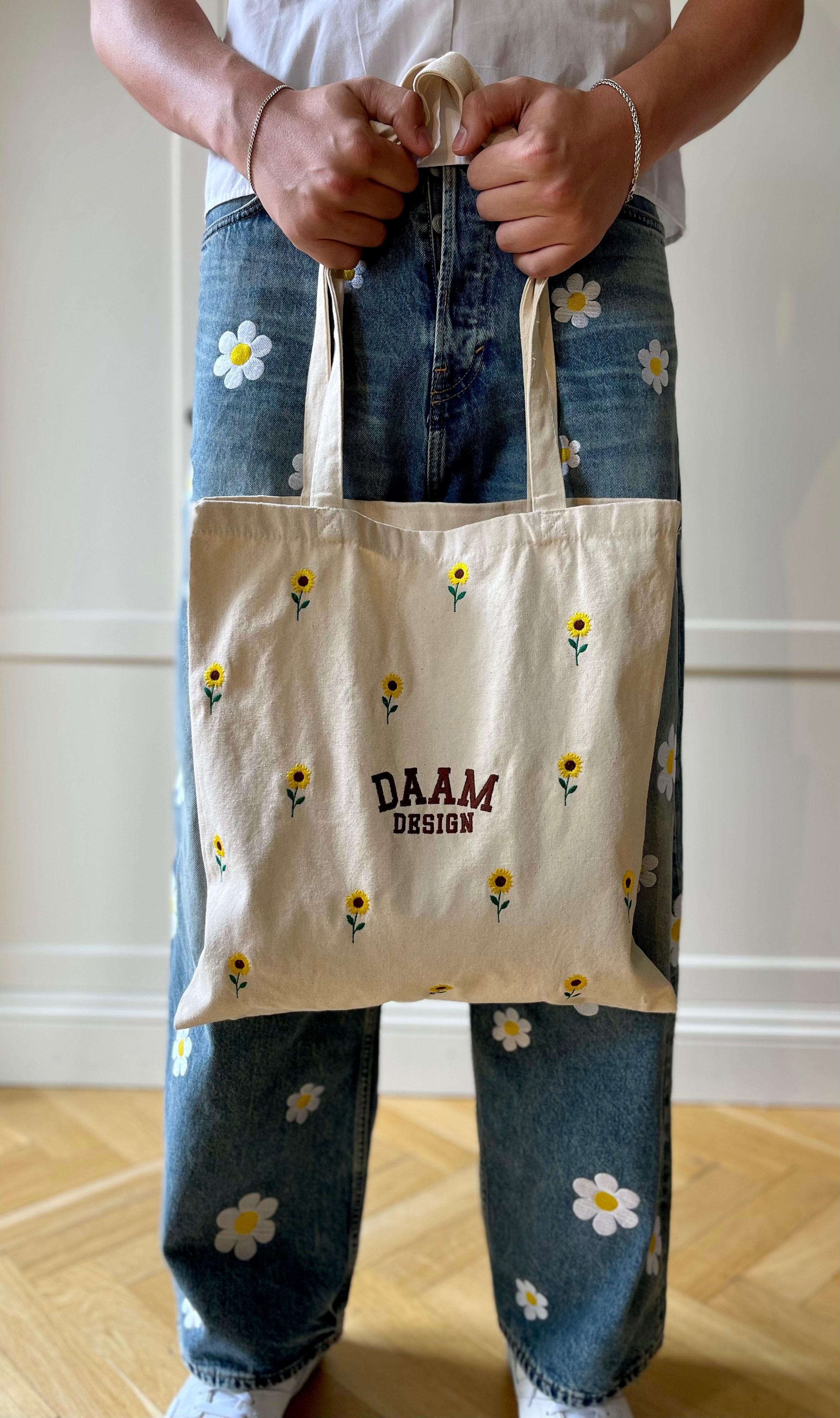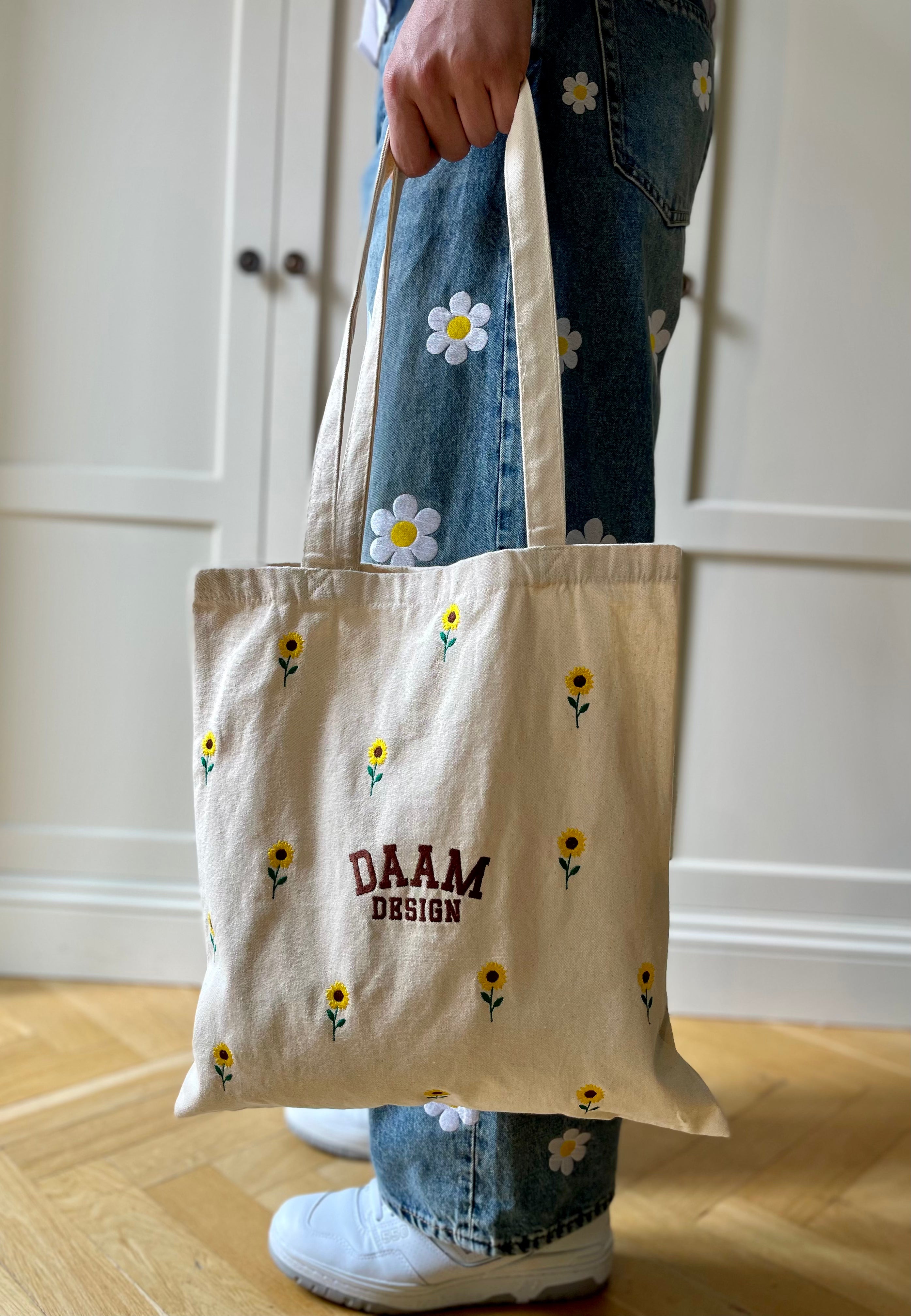 Introducing the Flower Tote bag. Each flower is uniquely placed and embroidered on to the bag, making no bag the other alike.